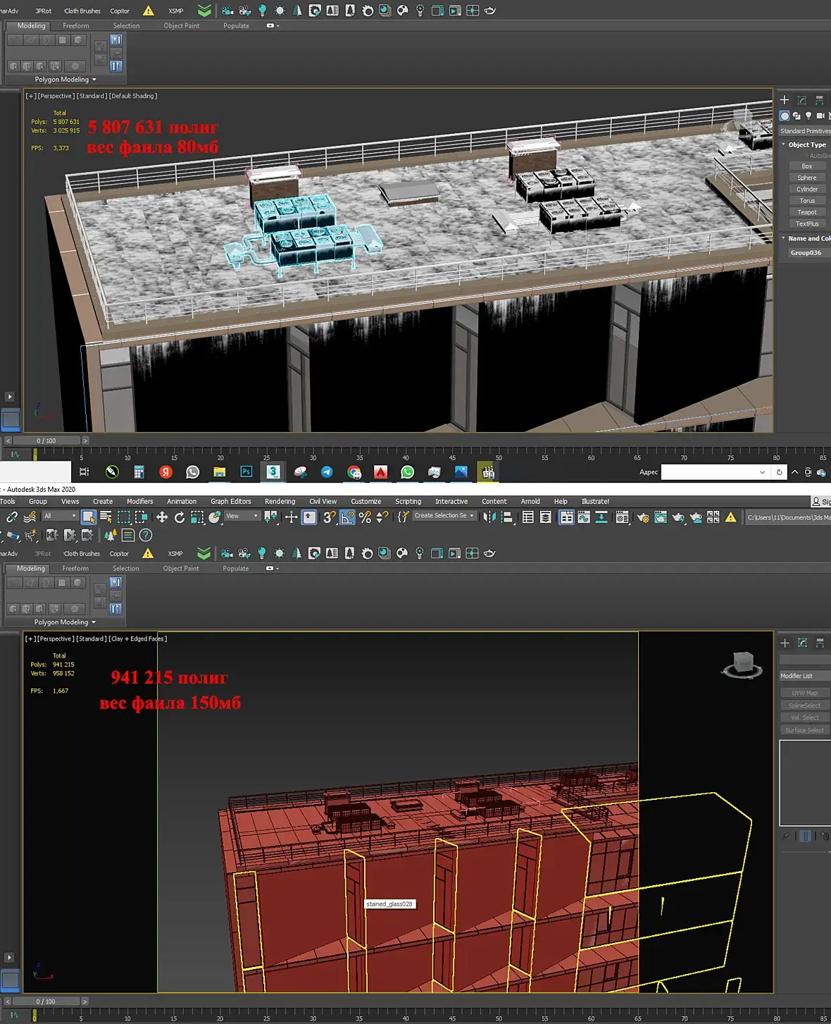удивляет только то изначально 5млн полигонов, после оптимизации 900 тыс, все конвертировано в полики, и вес при этом больше. когда выкладываешь фаил на модерацию, модер ругается что слишком много мелких обьектов, что все заатачить, что дико неудобно даже при работе с такими обьектами, когда берешь пипеткой, а там мультиматериал из 12 позиций и попробуй угадай какой куда материал назначен.хотя не понятно почему нельзя просто группировать. и такие вот аттаченные обьекты выходит занимают больше места, чем по отдельности