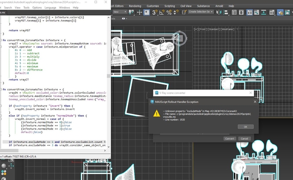 Возникла проблема с конвертацией сцен из короны в вирей. Может кто сталкивался с этим? Макс 24 , вирей 6, корона 11. Ошибка вылезает при конвертации чего угодно, отдельной модели или же целой сцены, бывает очень нужно, но ошибка всё обламывает