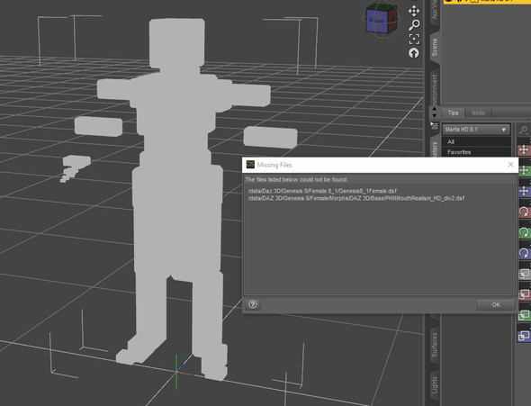 Всем привет! В дазе я совсем недавно и вопрос возможно нубский, но решения не нашел, в общем столкнулся с такой проблемой, добавляю модели с shadowcore или daz4free через install manager, и когда пытаюсь их в дазе открыть для редактирования, у меня появляются ошибки missing files и сама модель какая-то с острыми углами. Может кто знает как это исправить?