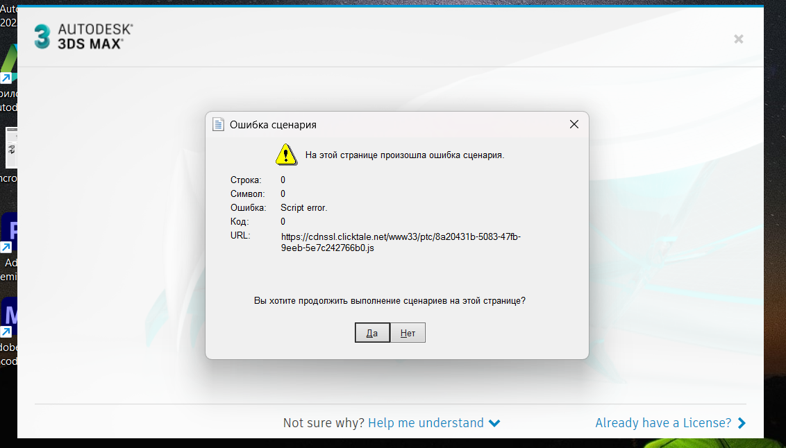 Добрый день. При попытке открыть 3D max выскакивает ошибка (на скриншоте). Пользовалась образовательной лицензией. Очень прошу помогите - горит проект!