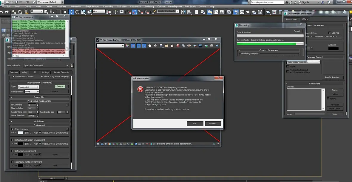 Сделала новую сцену, стала рендерить и тут Max начал ругаться и говорить об ошибке V-ray. См скрины. При чем другие сцены нормально рендерит - без проблем.