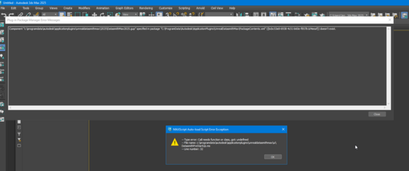 ругается на плагин датасмит для обмена модельками между пакетами типа анриала, голый макс бы так не ругался, может сборка какая то? или уже плагины ставили? у меня в 25 такого нет