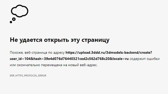 Доброе утро. Модель не загружается на сайт. Не удаётся установить соединение с сайтом. Страница по адресуhttps://upload.3ddd.ru/3dmodels-backend/create?user_id=407978& ;hash=61b11933f527a0a0dcd2d72d65503ee9&locale=ru может быть временно недоступна или перемещена на новый адрес. Исправьте пожалуйста.