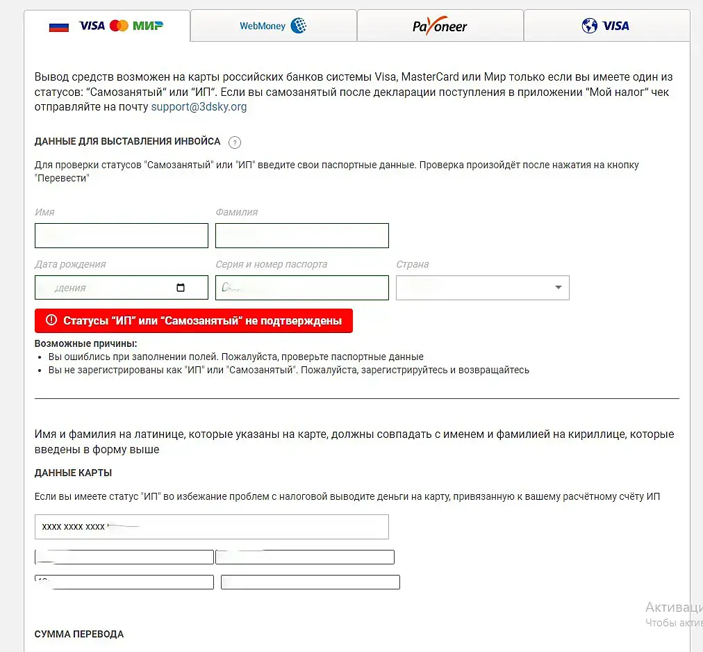 Статусы “ИП” или “Самозанятый” не подтверждены Возможные причины:Вы ошиблись при заполнении полей. Пожалуйста, проверьте паспортные данные Вы не зарегистрированы как "ИП" или "Самозанятый". Пожалуйста, зарегистрируйтесь и возвращайтесь