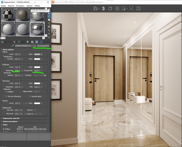 Добрый день всем! Перехожу с вирея на корону. Никак не могу добиться хорошего отражения в мраморной светлой плитке. Хочется чтоб была глянцевая. Деревянная плитка отражает норм, а вот светлая ну никак не становится глянцевой(. Чуть-чуть видны проблески от подсветки на зеркале и все. По идее должно быть отражение черной рамки двери, перехода на стене от деревяшек к краске,.... Подскажите, пжста, почему? Что не так? Уже и IOR на максимум поставила, и Roughness по минимуму вроде. Что еще тут можно сделать? И вообще, как бороться с таким? Я заметила, что на темном ламинате, например, отражения ОК, а со светлым тоже мучаешься (((. МАХ25, CORONA 12.
