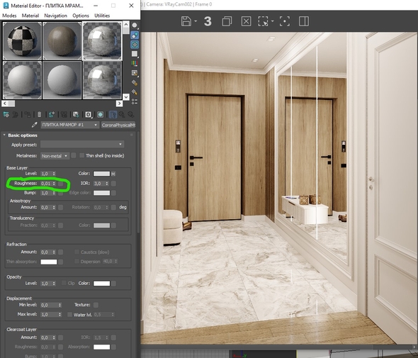 Просто огромнейшее спасибо всем 🙏 !!! Выкладываю что получилось с мрамором (свет пока не трогала) 1. CoronaPhisicalMtl_Rauhness 0,01 - отражения стали побольше, но опять же мало. 2. поменяла на CoronaLegacyMTL - пошло !!!! 3. Вернула CoronaPhisicalMtl и включила Clearcoat Layer - супер !!!! Понятно, что поковыряться еще, подкорректировать и текстуру и все остальное ..... Теперь буду разбираться со светом еще. Пересмотрела кучу уроков, может кто-то посоветует что-то конкретное? 🙏 особенно в закрытых помещениях