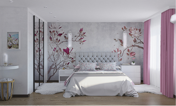 По дизайну - мое субъективное мнение - слишком много розового. Подсветка особенно убивает. Если это, предположим, комната для девочки - необязательно лепить розовый везде. Достаточно было акцентом сделать обои. Кстати, при таких обоях - такой задник у кровати можно не делать, а то внимание на себя перетягивает. Вообще стилистика должна строится вокруг одного основного элемента мебели и одного ведущего цвета, ну максимум двух.