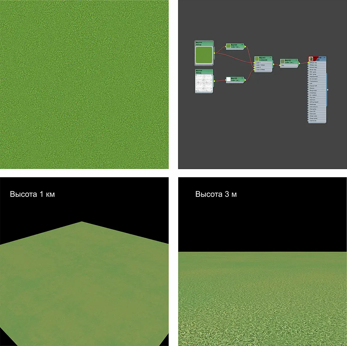 Одна текстура, одна карта дирта, 5 минут на настройку дифузного цвета и никакого тайлинга нигде, ни с высоты километр, ни с трех метров. Обращаю внимание, это ни в коем случае не образец идеального газона, а просто иллюстрация принципа. На доводку уйдет немного больше времени: карту смешивания можно поискать более подходящую, цвета докурутить и т.д.