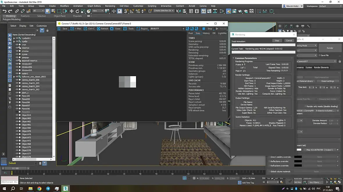 Доброго времени суток. Столкнулся с такой проблемой, что в интерактивном рендере все хорошо и все работает, а когда нажимаю на кнопку рендер, то происходит то, что показано на скриншоте. При этом комп нагружается. В чем может быть проблема?