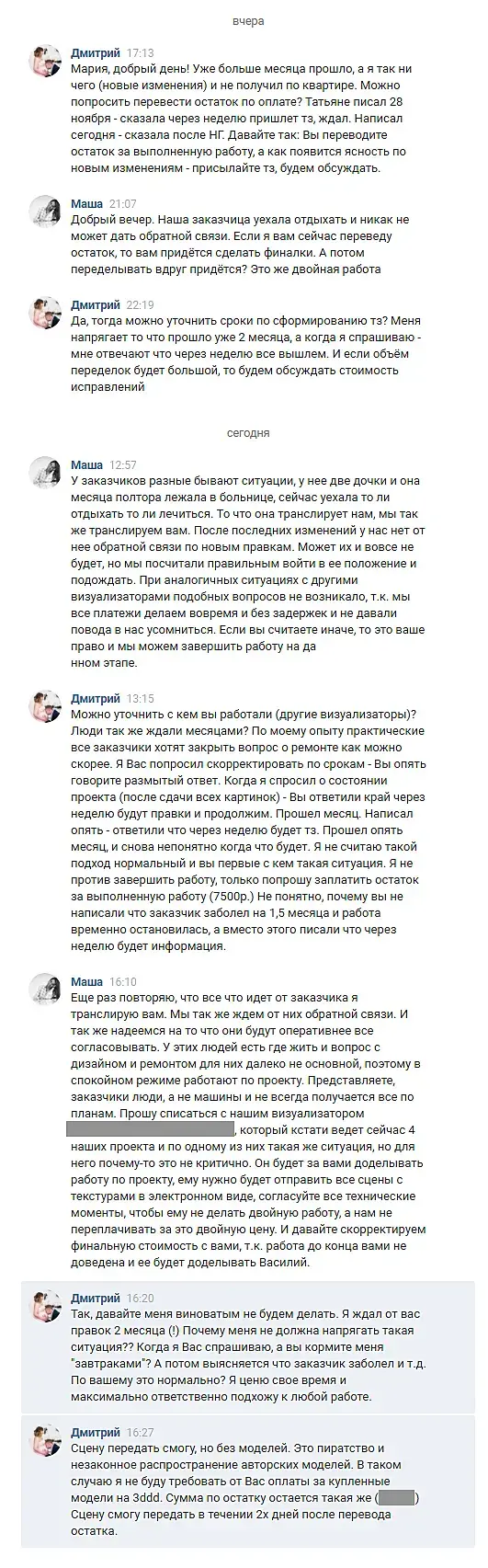 Наверное поторопился с темой, извиняюсь. В общем ситуация такая: Начали проект квартиры. Сразу скажу что дизайнер компании давал четкое тз и весь процесс был достаточно неплохо налажен. По ходу проекта решили Делать чисто интерьерное решение, а мелочи в виде декора добавим на финише. При отправки изображений по последним помещениям сказали что будут обсуждать с заказчиком и через неделю дадут тз с изменениями. Я согласился, прошло немного времени - написал (30 октября) сказали немного подождать и скинут тз. Подождал до 28 ноября - ответили что скинут следующим вечером. Ни чего не скинули. Написал вчера - сказали после НГ. По оплате осталась небольшая часть, но такой подход очень не понятный. Собственно в очередном сообщении сказали : "...При аналогичных ситуациях с другими визуализаторами подобных вопросов не возникало...". Вот и решил спросить у других визуализаторов)