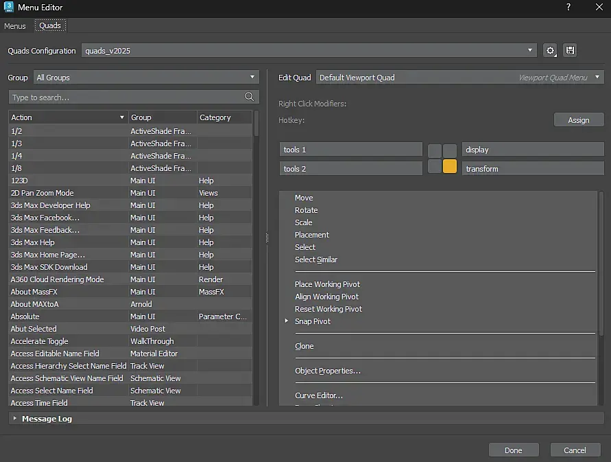 Уважаемые гуру 3Dsmax. такой вопрос у меня возник, давно пользуюсь панелью Quads для быстрого поиска функций программы и хотел бы добавить туда определенный блок, который можно найти в верхнем левом углу программы 3dsmax (окно viewport - Main Toolbar и в нём Selection Filter) на скрине показал. Так как я пользуюсь Forest Pack и Rail Clone плагинами, не хотелось бы постоянно вести мышку в эту область и спокойно залезать через меню Quads и находить эту функцию. Вопрос именно в том, как найти эту вкладку Selection Filter в настройках Quads? Потому что там я её не нахожу, может кто уже сталкивался с такой темой?