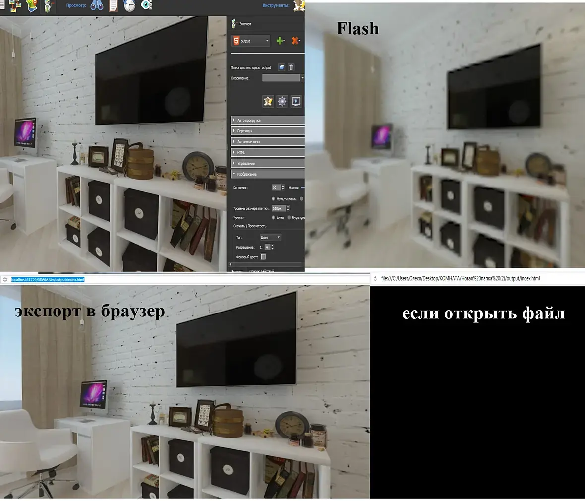 Добрый день! Удалось ли решить данную проблему?Я конвертирую панораму в html5. Но при просмотре в браузере (хром) черный экран. Пыталась решить проблему таким образом, но не помогло https://www.youtube.com/watch?v=Xlju2uEOQy8 . Кто-то сталкивался?Панорама конвертирована в Pano2vr6.