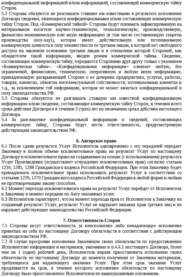 6. Авторское право 6.1 После сдачи результата Услуг Исполнитель одновременно с его передачей передает Заказчику в полном объеме исключительное право на результат Услуг по настоящему Договору и исключительное право на создаваемые на основе (с использованием) результата Услуг Произведения (осуществляет отчуждение исключительных прав) согласно статьям 1234, 1285, 1288 Гражданского кодекса Российской Федерации. При этом Заказчику будет принадлежать исключительное право использовать результат Услуг в соответствии со статьями 1229, 1270 Гражданского кодекса Российской Федерации в любой форме и любым не противоречащим закону способом.6.2 Момент перехода исключительного права на результат Услуг перейдет от Исполнителя к Заказчику в момент передачи по Акту оказанных услуг.6.3 Исполнитель гарантирует, что на момент перехода прав от Исполнителя к Заказчику на созданный результат Услуг, результат Услуг не нарушает никаких прав третьих лиц и не нарушает действующее законодательство Российской Федерации.