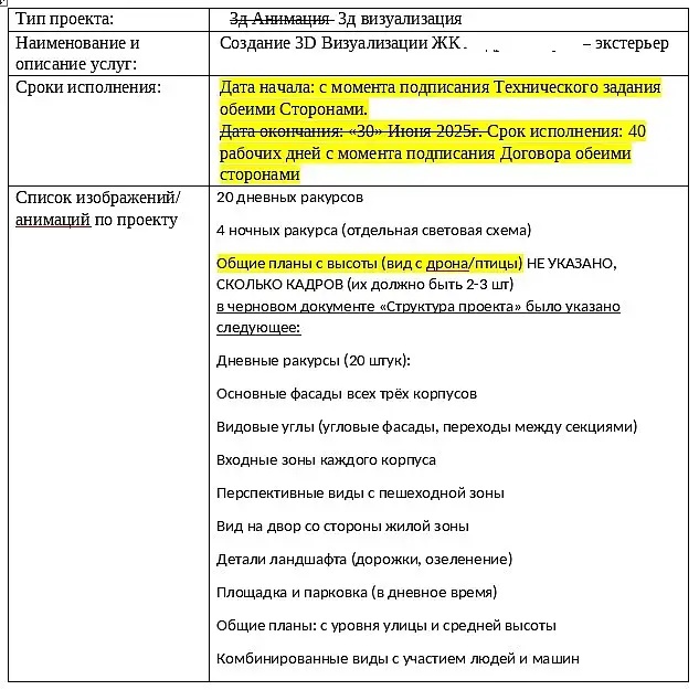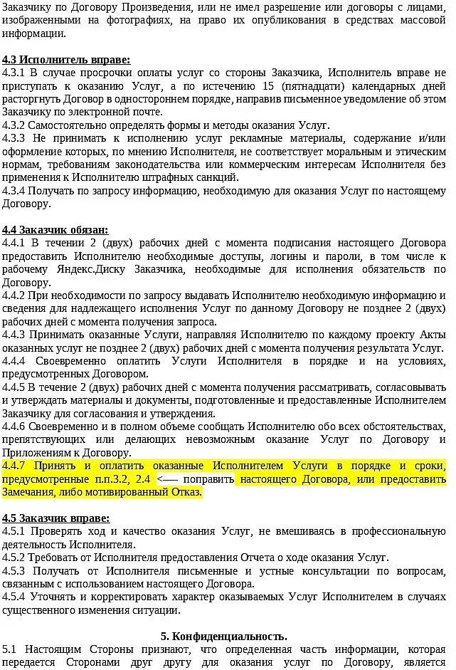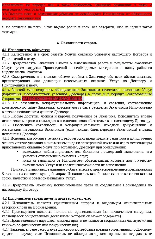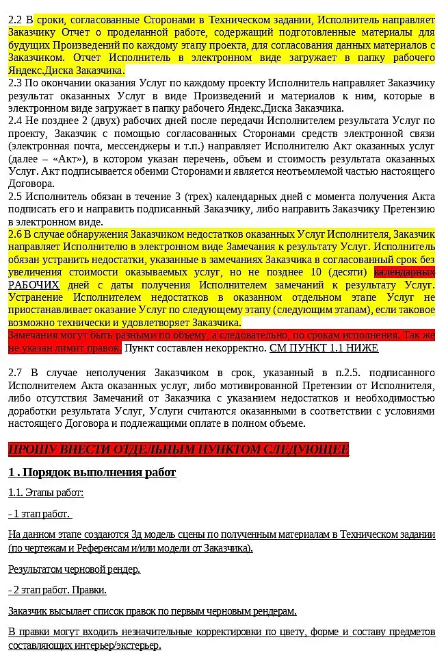 Это черновик с моими исправлениями, там много неточностей. А в договоре совершенно нет пункта о правках. Точнее, есть вот такое: 2.6 В случае обнаружения Заказчиком недостатков оказанных Услуг Исполнителя, Заказчик направляет Исполнителю в электронном виде Замечания к результату Услуг. Исполнитель обязан устранить недостатки, указанные в замечаниях Заказчика в согласованный срок без увеличения стоимости оказываемых услуг, но не позднее 10 (десяти) календарных РАБОЧИХ дней с даты получения Исполнителем замечаний к результату Услуг. Устранение Исполнителем недостатков в оказанном отдельном этапе Услуг не приостанавливает оказание Услуг по следующему этапу (следующим этапам), если таковое возможно технически и удовлетворяет Заказчика. 4.1.4 За свой счет исправить обнаруженные Заказчиком недостатки оказанных Услуг (нарушения, несоответствия условиям Договора) в сроки и в порядке, согласованные Сторонами. СМ ПУНКТЫ О ПРАВКАХ ВЫШЕ