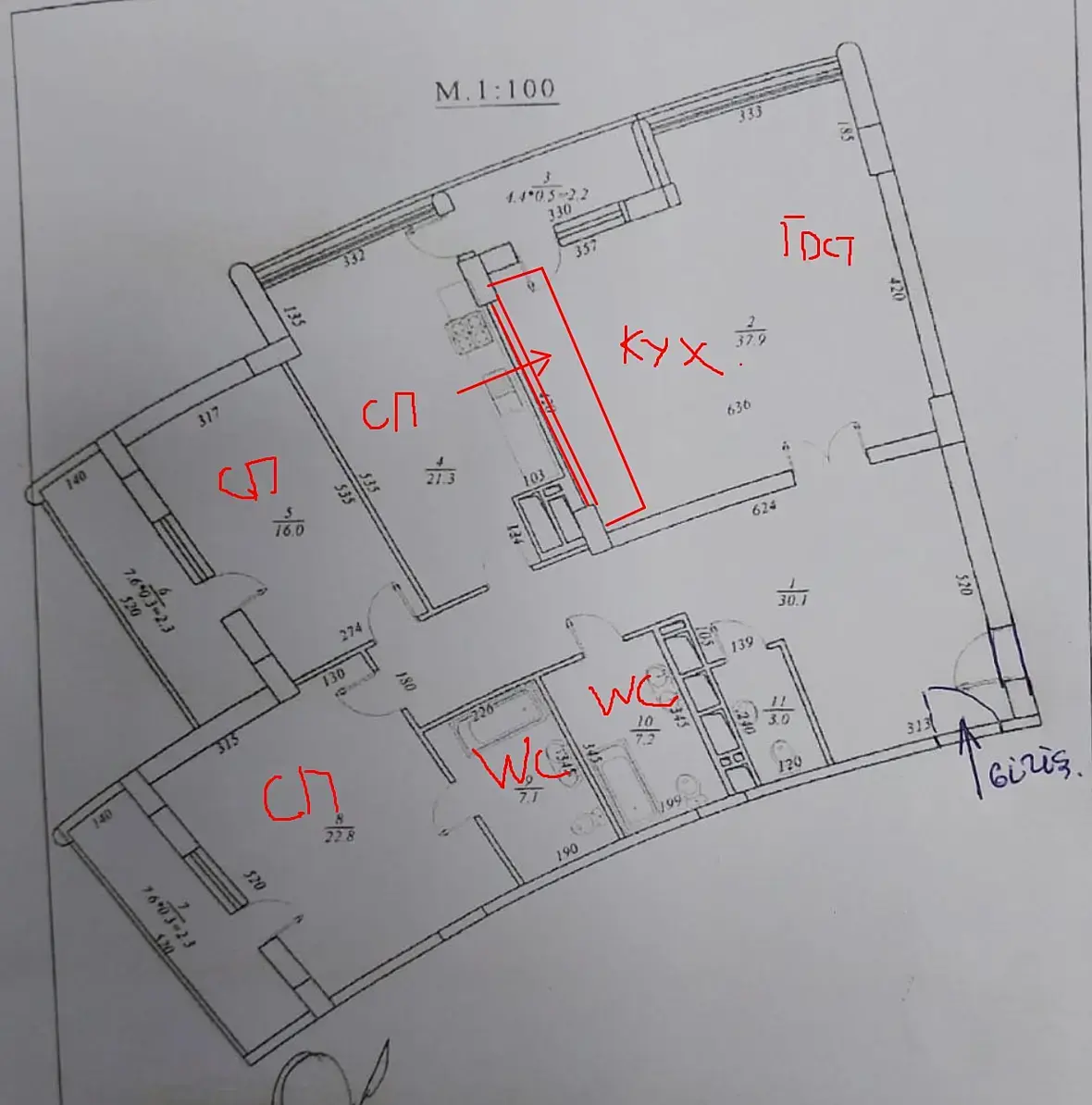 , дана квартира трехкомнатная, необходимо из нее сделать квартиру с тремя спальнями, желательно с двумя санузлами на всю квартиру. Какие идеи? Предложила комнату 22,8 кВ поделить на две части и санузел превратить в проход с местом для хранения, но они хотят сохранить санузел тоже