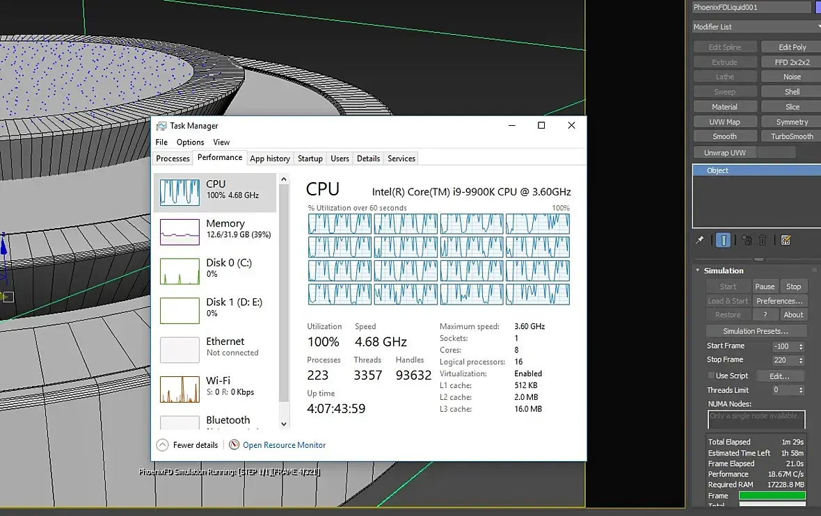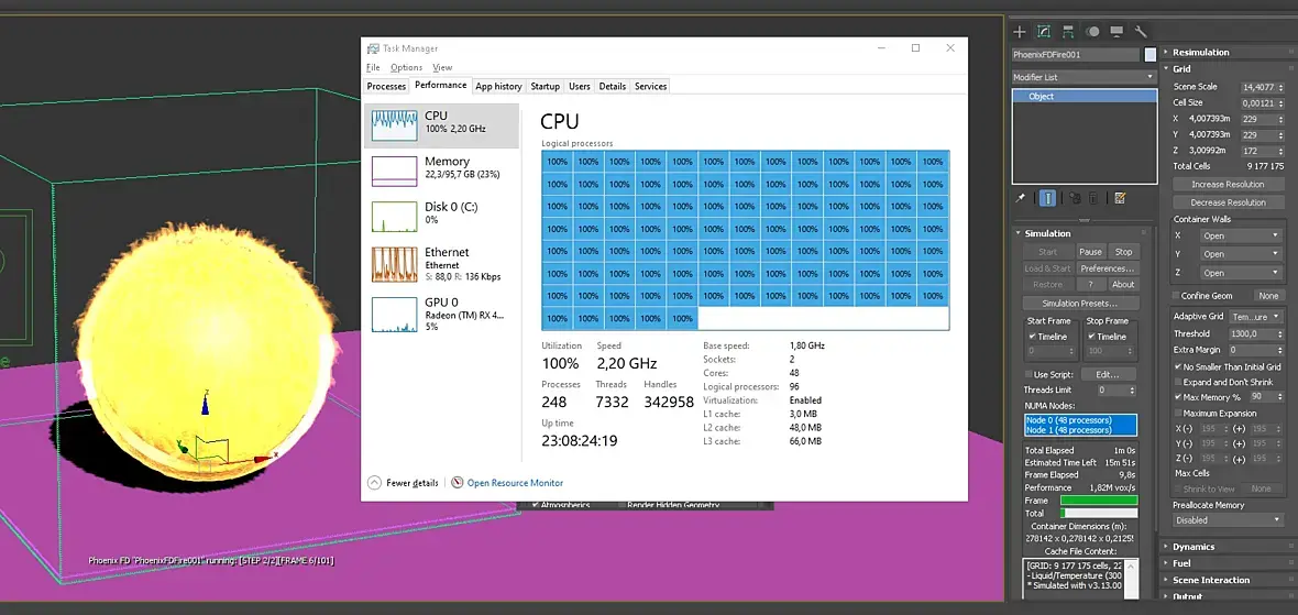 Phoenixfd многопоточный плагин, при симуляциях задействует все ядра проца.