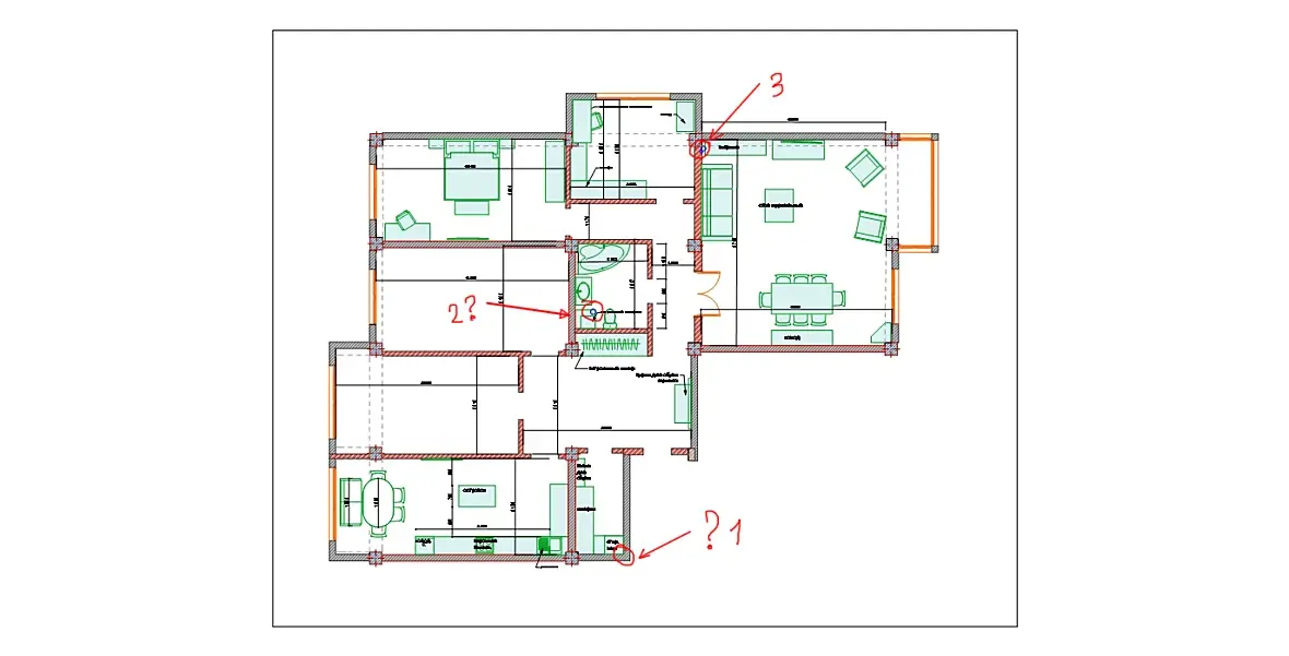 да с лишним поворот я конечно пересмотрю вариант если вы имеете ввиду цифру два где указали , а где цифра 1 я укажу , я варианты еще не завершила думала здесь не возникнет вопросов но не тут то было) конечно закончу и в красивом формате покажу заказчикам) а на счет планировки пока не получилось кухню и зал вместе расположить в верхней части ) но еще подумаю по этому поводу