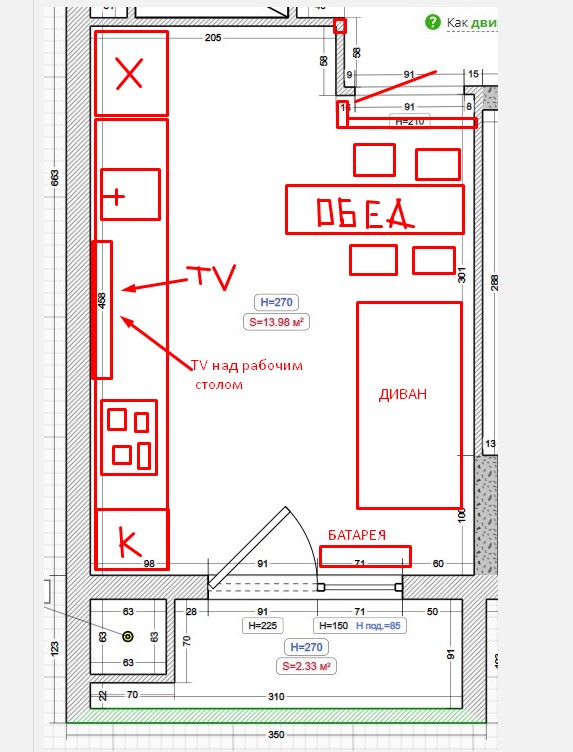 Планировка кухни-гостиной 13 кв.м.