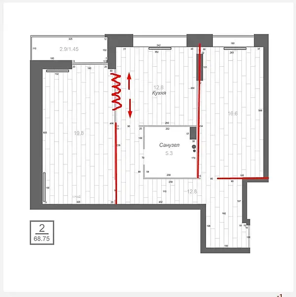 Автор, меняйте только правое и левое помещение, по желанию. Кухню и санузел не трогайте. Всё равно в конце темы придёте к этому. Не тратьте время зря, начинайте закупать плитку и смеси