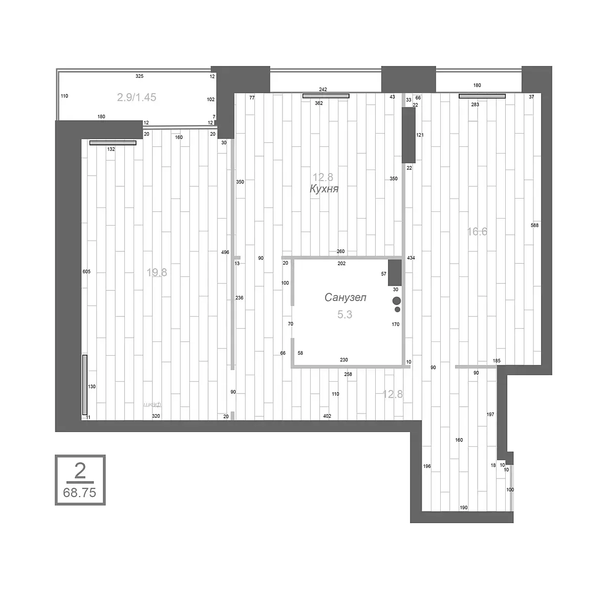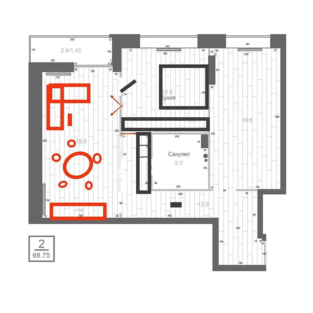 Там кухонный гарнитур получается длиной от силы 2400мм (даже не получается): холодильник, плита, раковина и 1 секция столешницы. В 70 квадратах соорудить кухню, размером, как в хрущёвке, это ну такое себе. Хотя если гарнитур разделить и вниз что-то перенести...