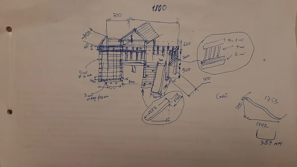 ну а ты бы смог слету не только брус сложить, но и внешний вид забабахать. где брус, где пластик, из чего горка, что за и из чего решетка слева, что на обратной стороне, конструкция крыши, узлы креплений, какой цвет где.