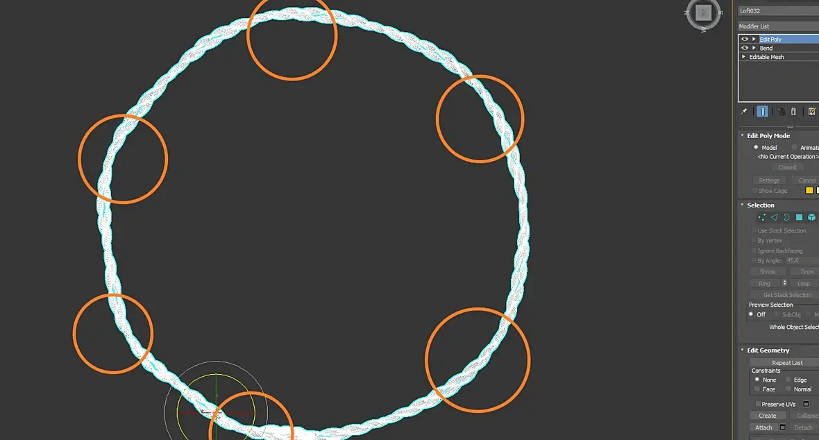 Прошу совета как сделать провода спиралевидные и вдобавок закрученные один вокруг другого. Сделал лофтом, пустил по пути но видны явные заломы через определённые промежутки (если делать с помощью бэнда- тоже самое). Сетка изначально очень плотная, поэтому должно все гнуться без проблем.. Вот скрин: