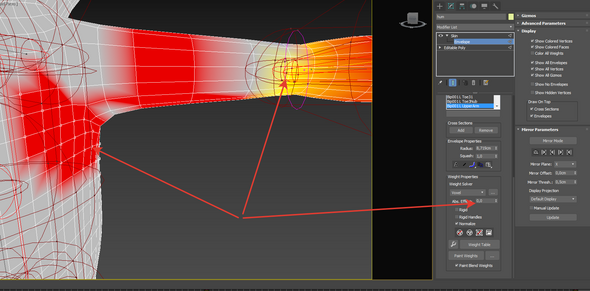 Всем привет! Я побую разобраться с привязкой котей. Взял Biped и пытаюсь привязать его к телу, но вот я выделил кость, а ее часть захватила кусок туловища. Я выделил эти вершины и задал им 0 влияния, так же я отодвинул саму область влияния далеко к локтю, но эти вершины по прежнему обозначены красным и участвуют в передвижении кости.Подскажите пожалуйста куда копать?