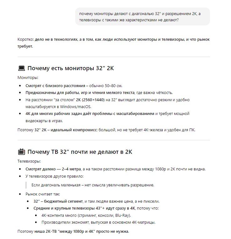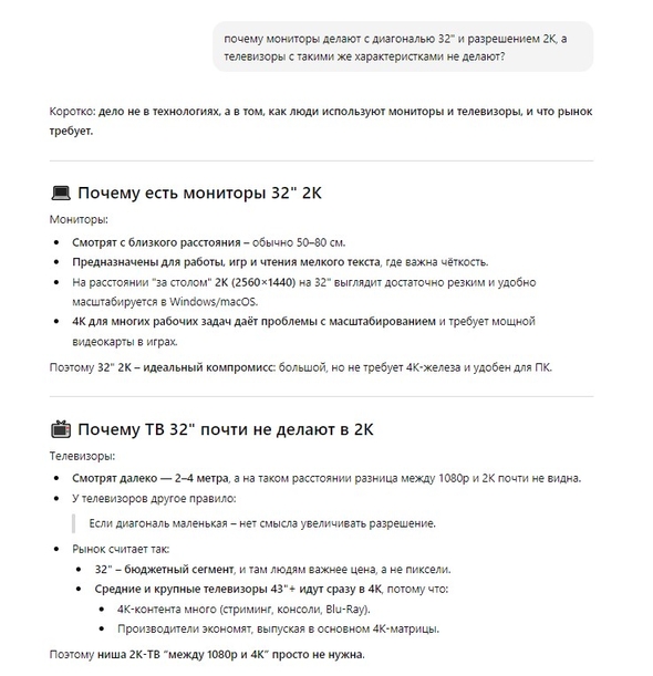 Как бы звучит логично, но у всех 32" мониторов очень бедная обвязка по портам, слабый звук (или вообще нету), блок питания на верёвочке отдельный вообще колхоз. Телевизоры 32" с разрешением 2K просто выдавили бы всю линейку этих мониторов, потому что матрицу уже давно в теликах хорошую делают, портов там обычно 2-3 hdmi по умолчанию (в моём телике вообще 4 hdmi), всегда есть USB и зачастую не один, звук всегда есть хороший, ну и плюсом - это же телик, причём обычно смартовый и по цене недорогого монитора. Ещё и выбор будет, так как производителей до Луны и конкуренция бешеная.