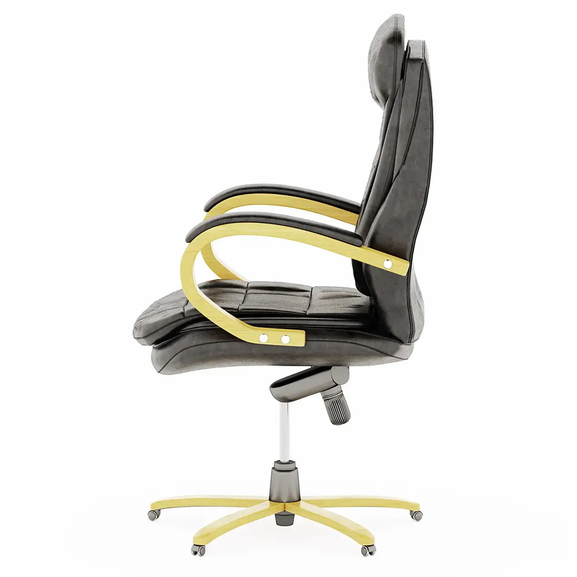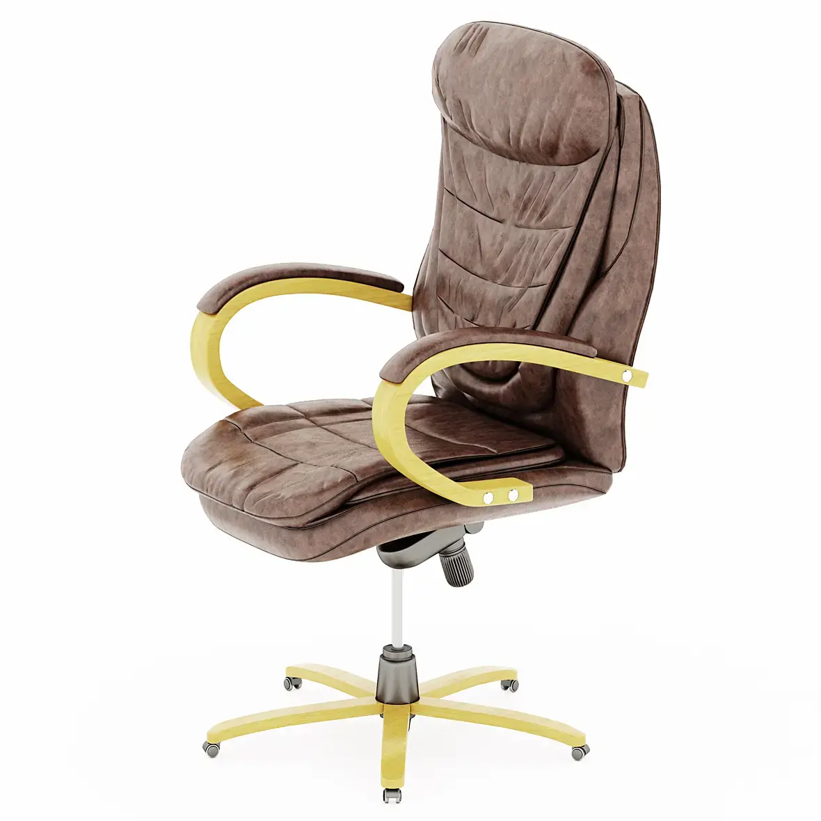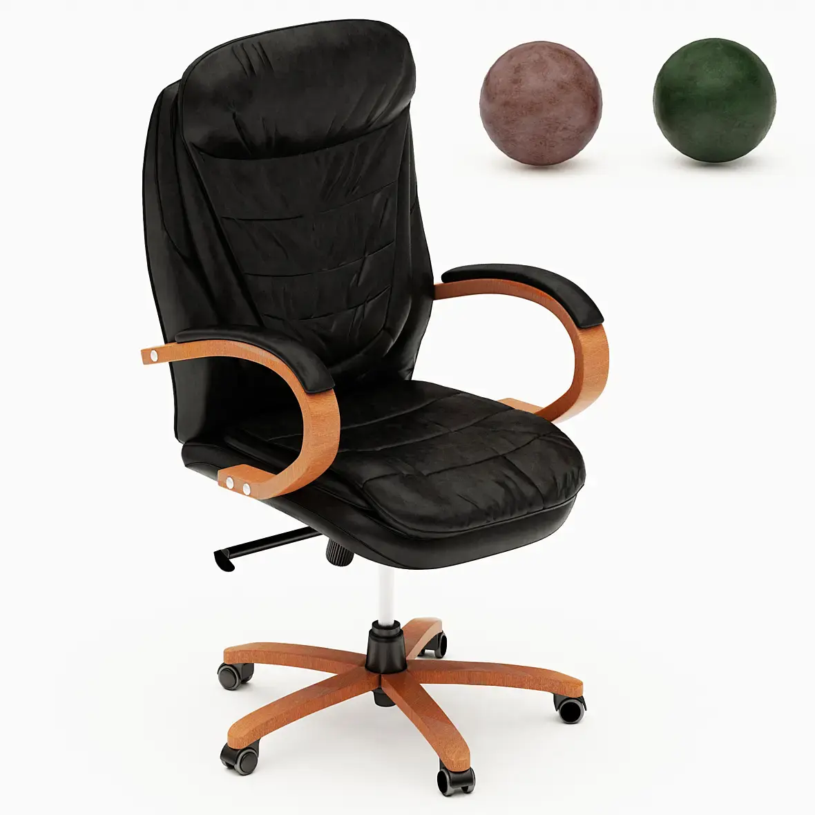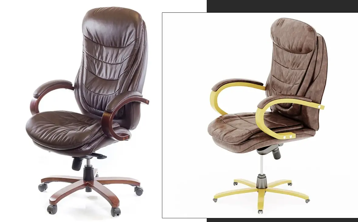 Все материалы нужно переработать , что за блестящая кожа то такая)) оч странные желтые ручки (оригинала не видел конечно) , но все же, нога очень тонкая , сомневаюсь что в реале так же , она тупо сломается как по мне , колеса оч маленькие , странная пропорция , думаю дело в модели , серая модель лучше смотрится , чем с материалами , нужно короче целиком все доработать , гляньте в базе какие стулы , освещение , материалы , подача , на них ориентируетесь , примеров миллион , ну и ориг. стул бы увидеть)