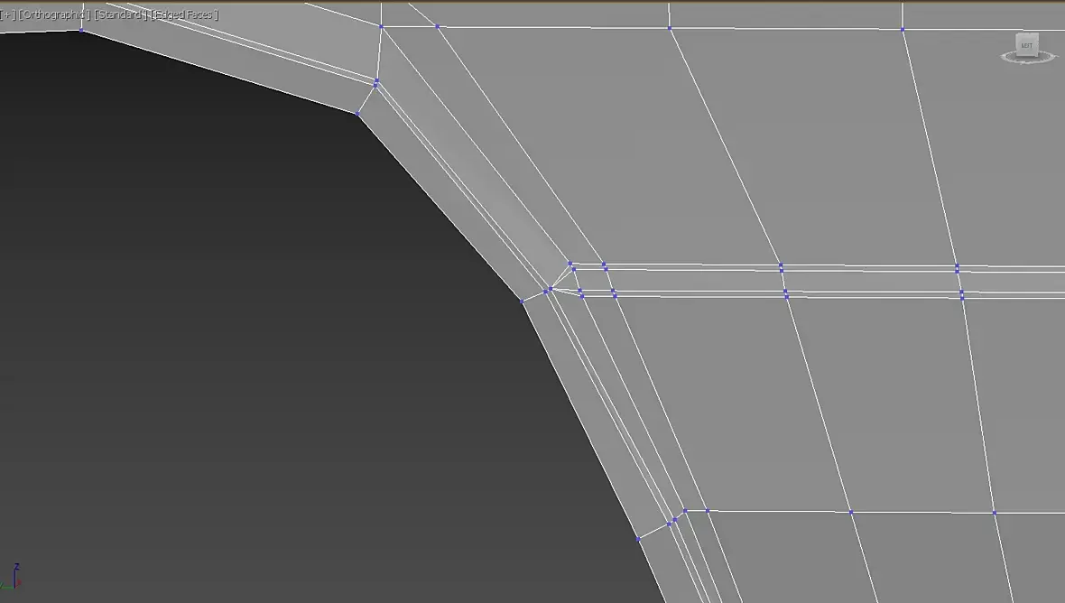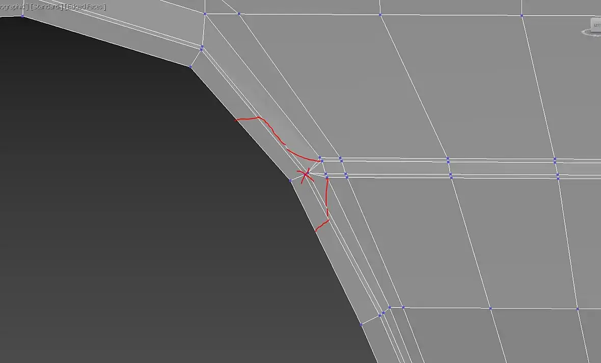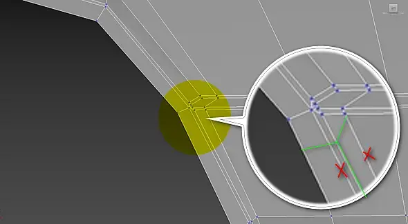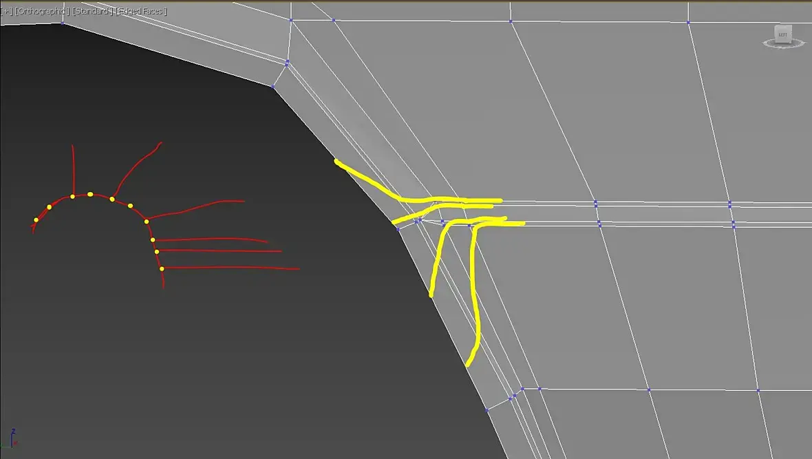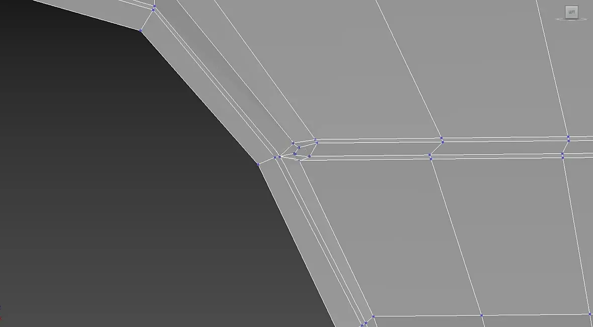 ну это так)по сути я показал только принцип для определенного стыка граней. далее надо смотреть на форму в целом ,строение сетки и т.д. а уже потом внедрять его туда.. я бы в целом собирал бы примерно так сетку. убрав длинные грани и треугольные полигоны