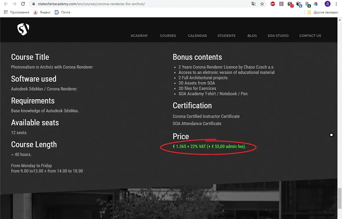 У официальных инструкторов цена курса составляет в среднем от 200 до 400 евро с человека, непосредственно сам курс Corona Academy проходит 1-2 раза в год в Праге, в главном офисе Chaos Czech, обычно в конце года, в расписании его пока нет, стоит 1000 евро, идет 2 дня.
