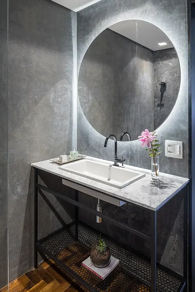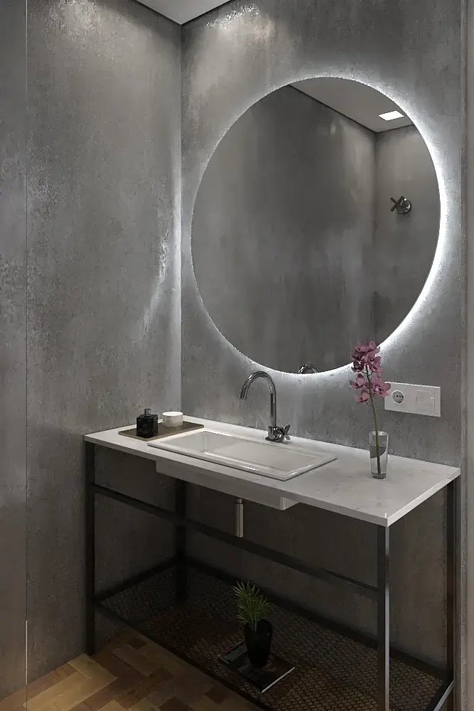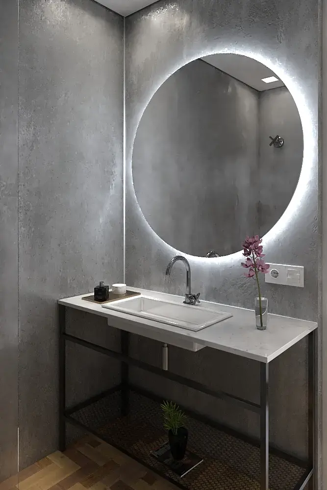 https://c2n.me/47GiZOM сделайте один дисковый светильник, радиуса меньше чем само зеркало и направьте его в стену