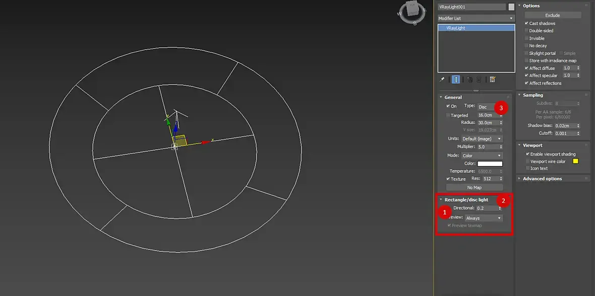 Всем добрый день! Изучаю 3ds max+vray, делаю визуализацию с фото. Не особо получается сделать подсветку за круглым зеркалом в ванной. Я использую vraylight (скрин прикрепляю)