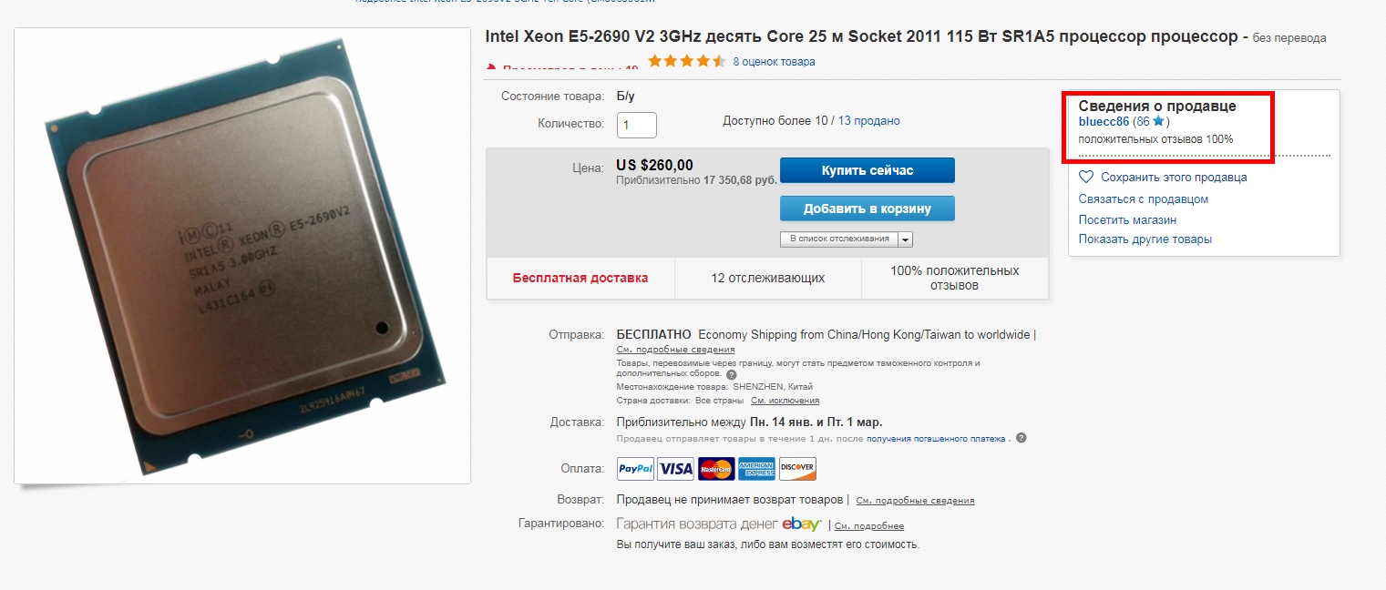 Всем привет! У кого есть опыт покупки железа с ebay. Интересуют xeon'ы. Есть восстановленные, есть бу, вариантов масса, а вот как выбирать? Может у кого есть проверенные продавцы?
