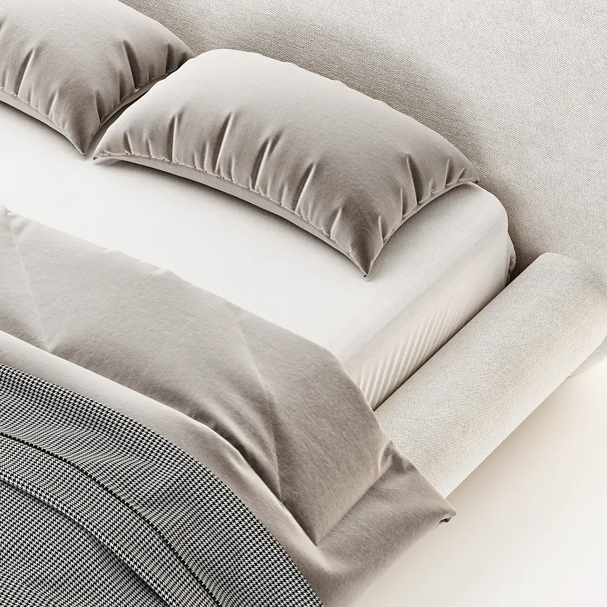 Складки на подушках слишком резко выполнены, нужно смягчить. Ткань так едва ли может натягиваться. Неправильная форма изголовья, линии уходят от правильных изгибов. Наполнение изголовья тоже вызывает вопросы. Остальное ОК.
