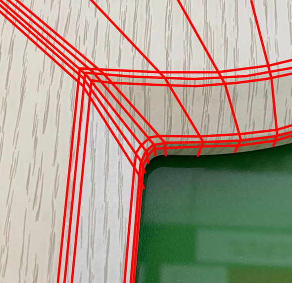 Есть кухонный фасад, делаю к нему филенку через Sweep или Bevel Profile. Прикреплю, фото и скриншоты для лучшего понимания. Проблема у меня в том, что внешний край с прямым углом под 90, внутренний со скруглением. Как это сделать правильно не ломая геометрию?*красным отмечен внутренний радиус, если по внутреннему ребру сделать Chamfer, что будет не совсем корректно. *pзеленым отмечена грань, на которую тоже нужно будет наложить Camfer.