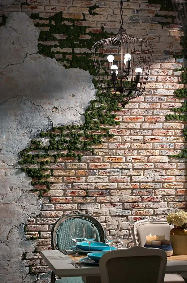Проще простого) берете модель кирпичной кладки с штукатуркой, какой вам нравится, и мох, и компонуете на стене.