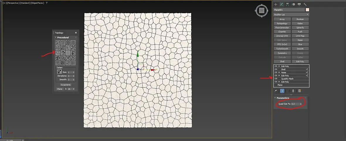 Если формы не сильно важны можно за три минуты можно на нужную площадь сгенерить через инструмент Generate topology, далее инстет всем полигонам, потом модификатор Qudify Mesh ( у меня параметр Quad Size - 0.5%). Далее выделяем бордеры переводим выделение в точки и накидываем модиф Noise. Настраиваем по вкусу. Далее модиф Shell для толщины, если нужна. И Настраиваем текстуру...