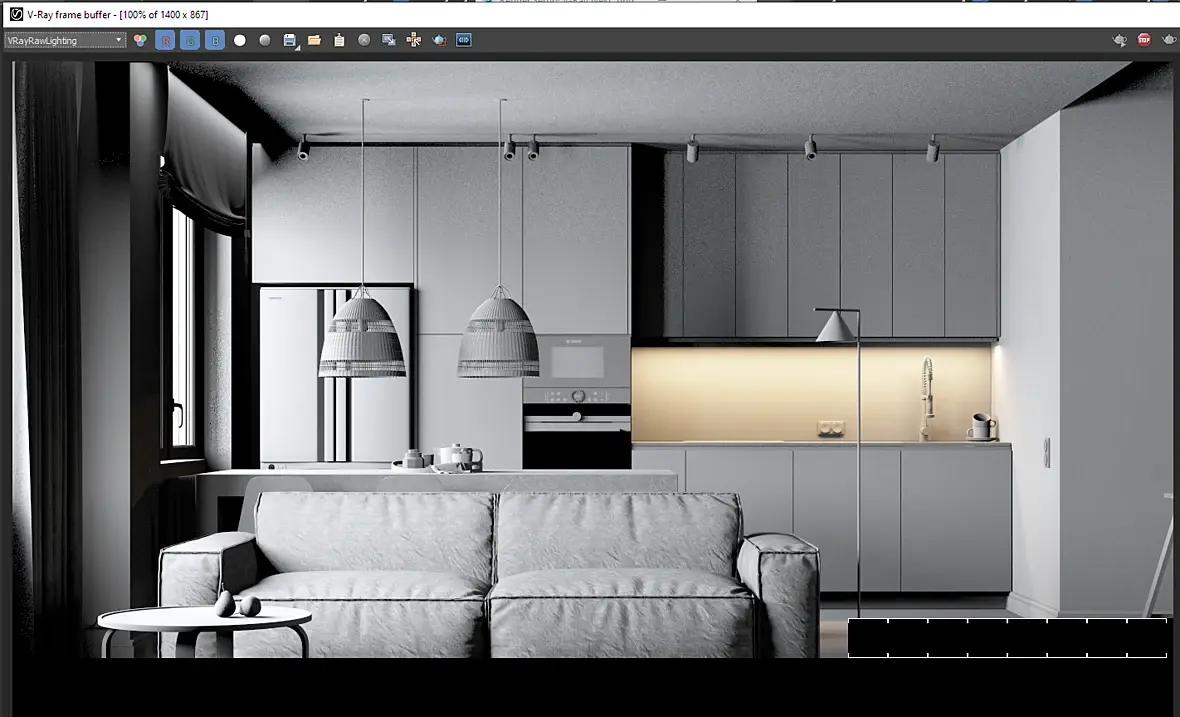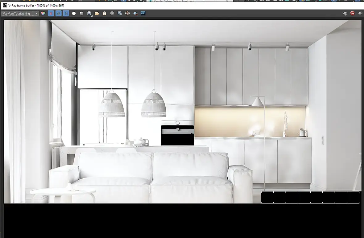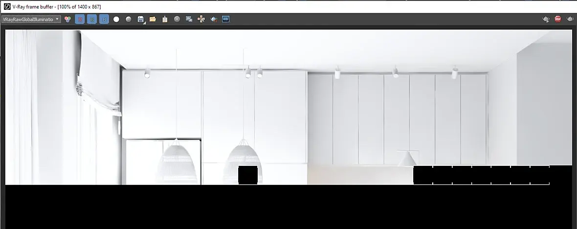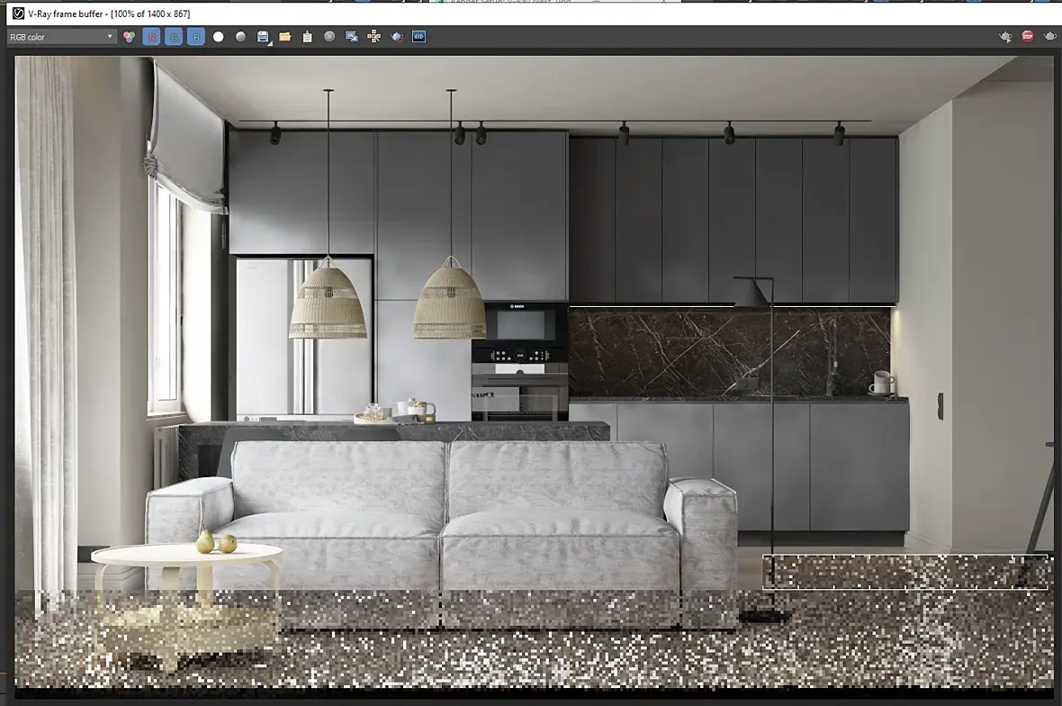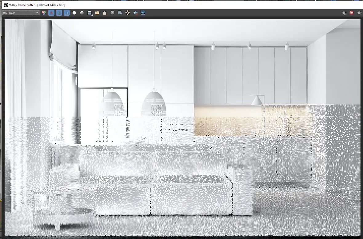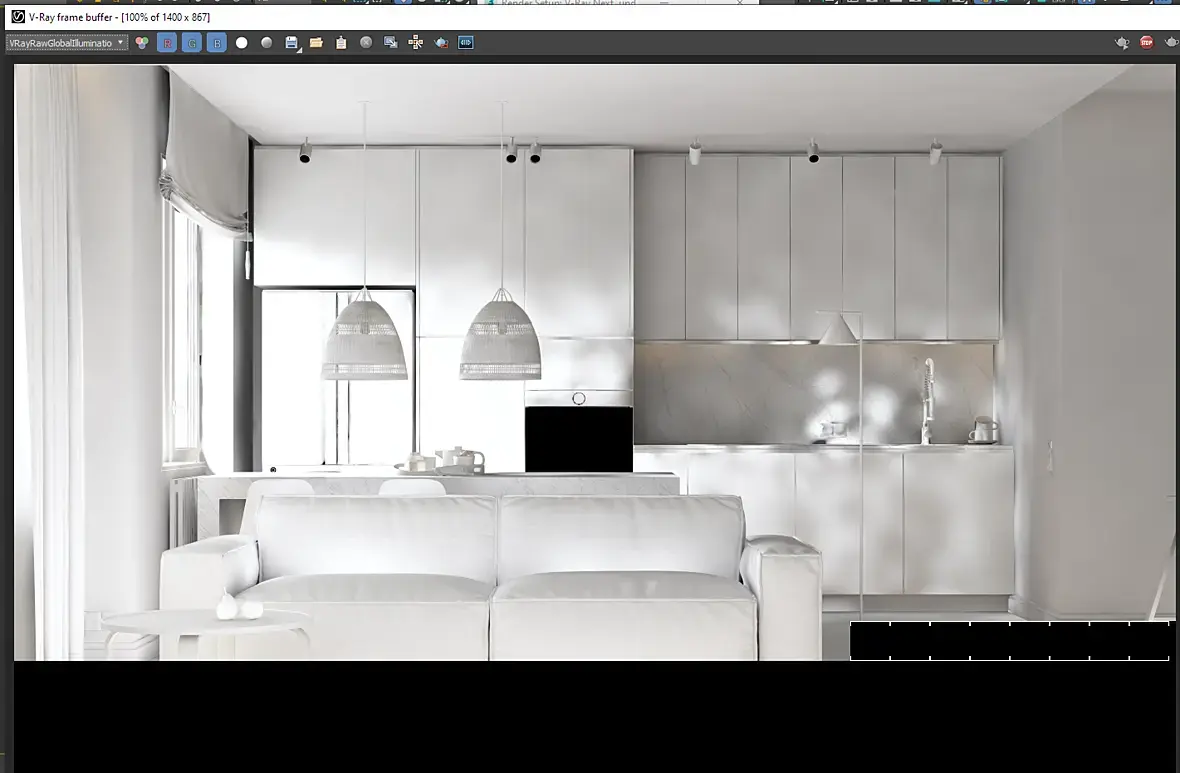 Попробуйте, Ксюша скрыть все предметы и оставить только коробку помещения. Рендернуть и посмотреть все-ли нормально. Если окей, то по очереди включать отдельные объекты и смотреть, когда появится лажа.