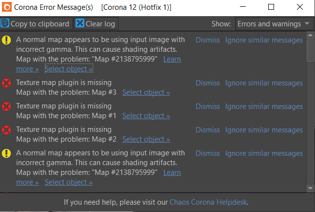 Перестала рендериться сцена в 3ds Max. Рендерю с помощью короны. При старте рендера вылезает сообщение с ошибками (ниже на скрине). Перенос в другую сцену не помог, удаление объектов с ошибками тоже. Что делать?
