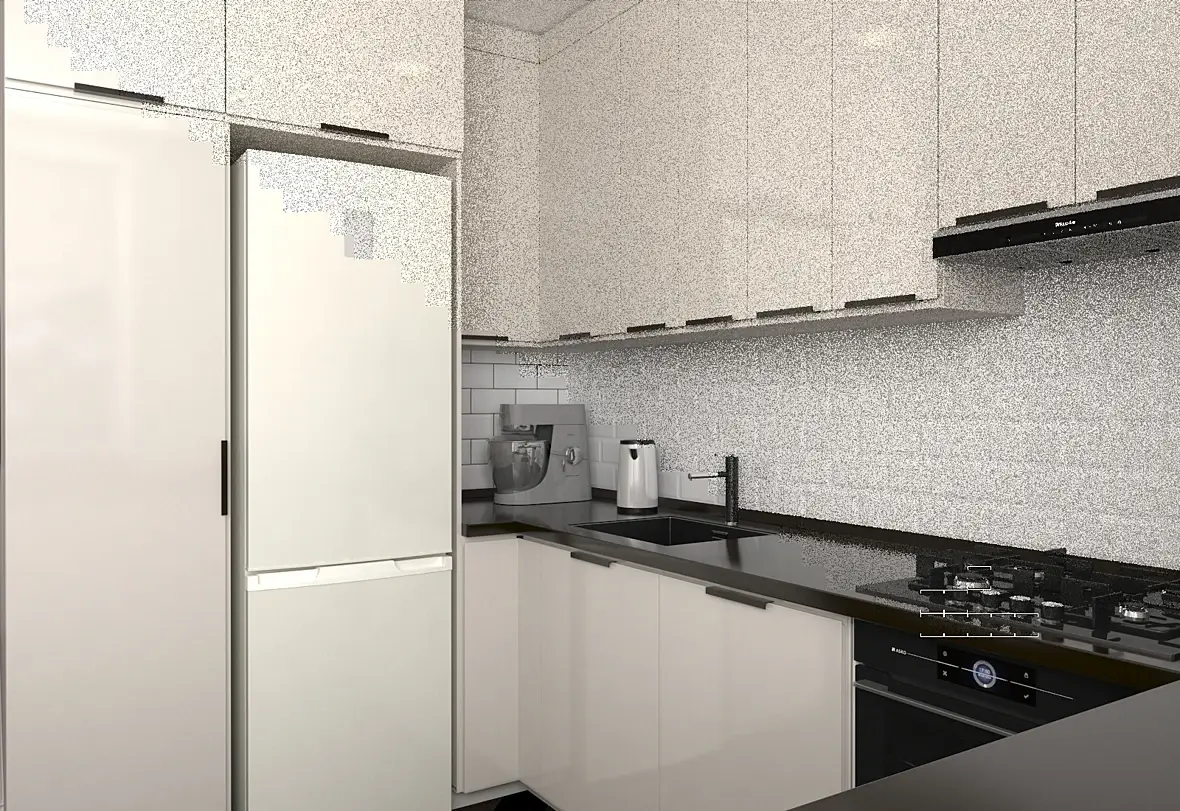 Добрый вечер. Помогите, пожалуйста. Первый раз столкнулась с таким.... Пока идет просчет рендера, все ок. Как только заканчивается - картинка становится такой. Все настройки ви-рей - с которыми работаю всегда (сейчас для тестового рендера). Пробовала скрыть все, кроме стен - результат такой же.