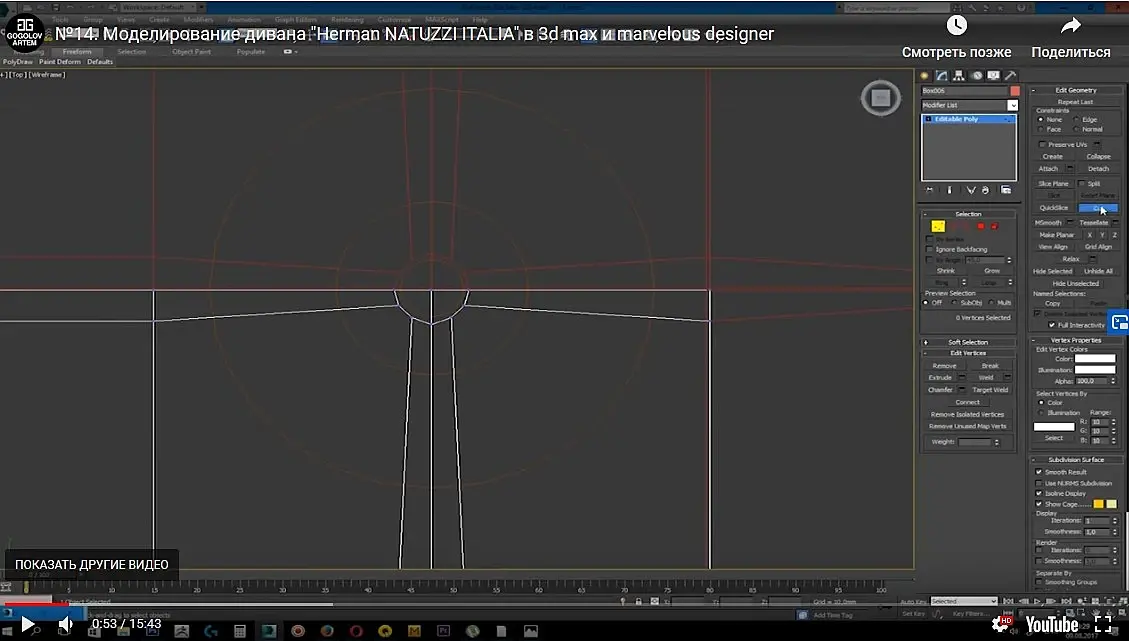 Все гораздо проще , он создал цилинр и опустил его под место где ему нужна окружность , потом перешел в режим top (T) , нажал режим вайрфрейм (f3) и при помощи инструмента cut нарезал ребра на своем диване , а дабы получился именно круг , то он двигал точки согласно форме нижнего цилиндра ( который оранжевым цветом) .А вообще вам рановато смотреть гоголова , вы сейчас этими видео больше запутаетесь , нежели что-то разберете.Посмотрите какие-то видео по полимоделированию под смуз(сабдив) для чайников . Посмотрите что такое geopoly , regularize .
