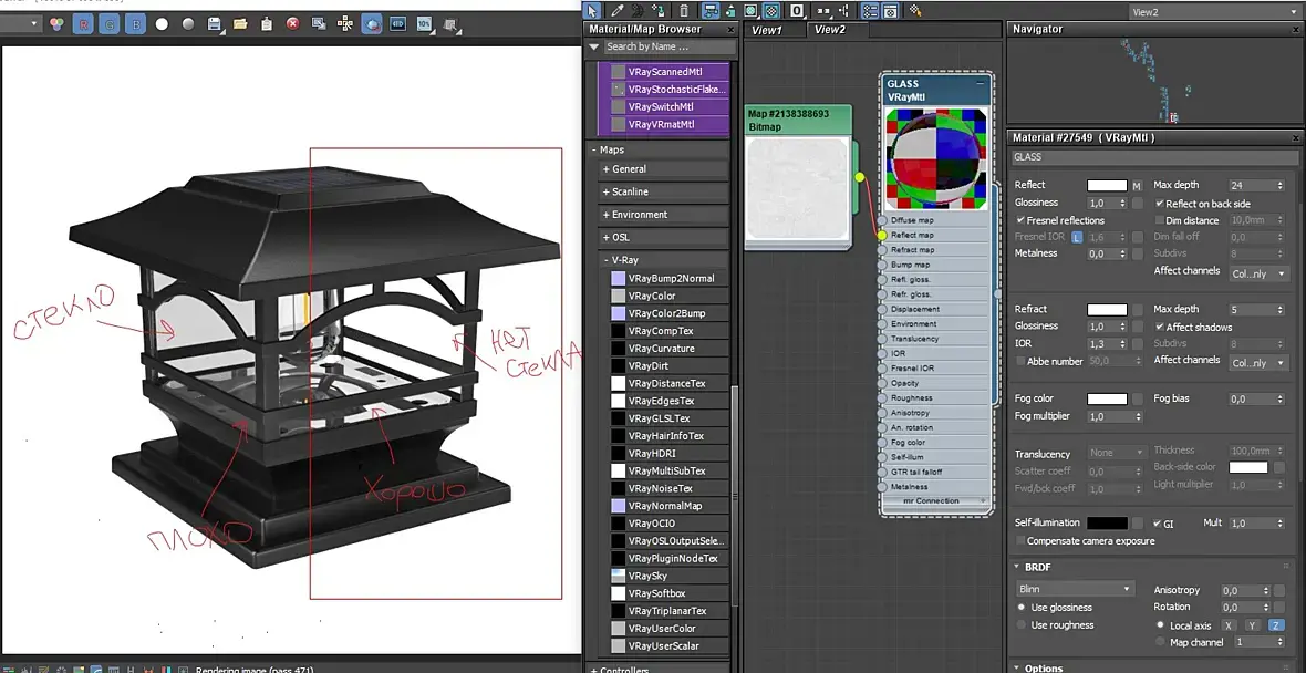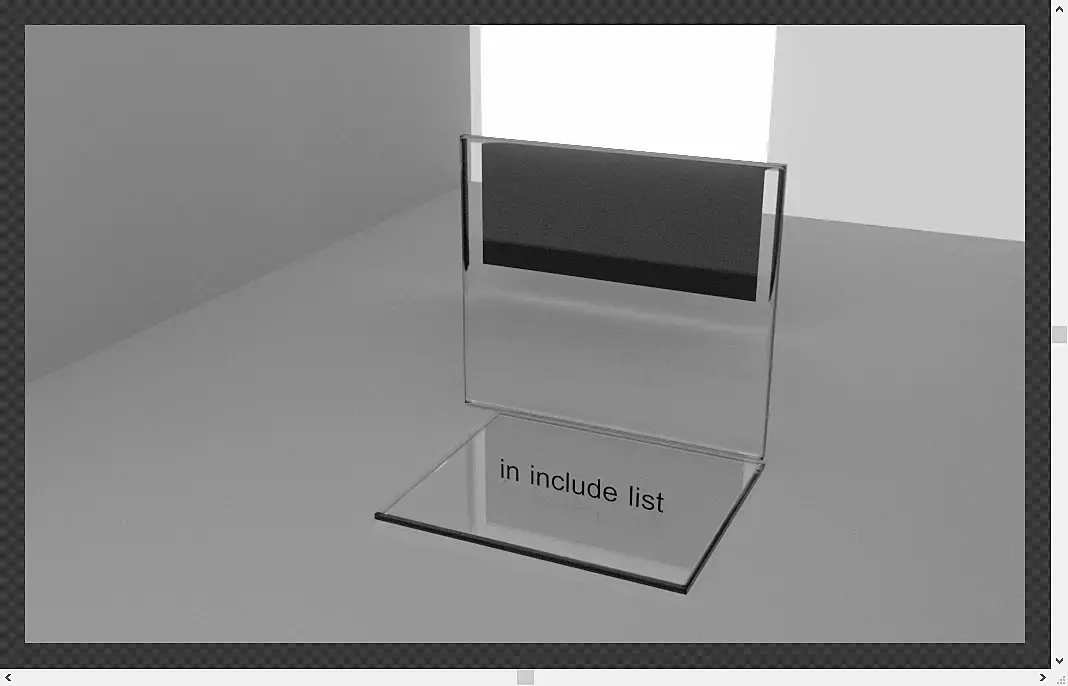 В этом может быть и проблема, в списке incude добавьте ваше стекло. Не факт что сработает но попробуйте. Ещё совет пока не добьетесь желаемого (чтоб отражение через стекло видно было) используйте чистое стекло без всяких текстур разных IOR на отражение и преломление и прочего, добавите потом.