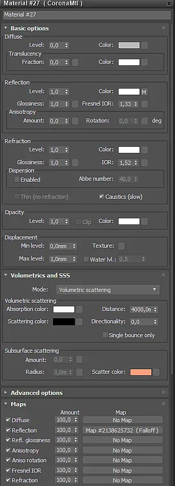 Скорей всего она просто недостаточно прозрачная. Поставьте дистанцию абсорбции сильно больше, тысяч 15, и попробуйте, и да, цвет поглощения воды не белый. Какой угодно, но не белый. Как правило грязно синезеленый. А еще для начала отключите каустику и попробуйте без нее, если все ок, потом включите. И да, коэффициент рефракции у воды тоже 1.3. Фалофф не нужен. Собственно смысл френеля как раз в том, что вы пытаетесь сделать фалоффом.