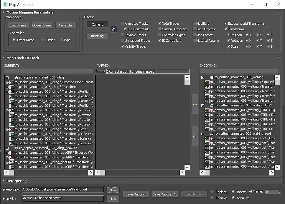 При загрузке анимации выходит окно с надписью No tracking Are mapped Create map file