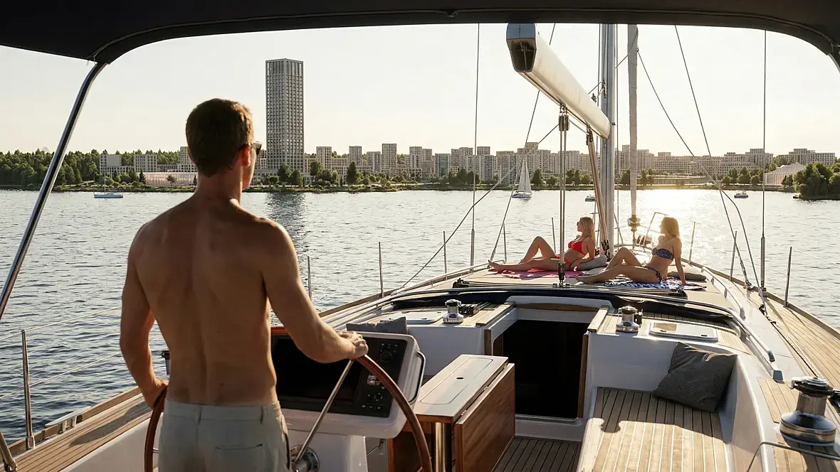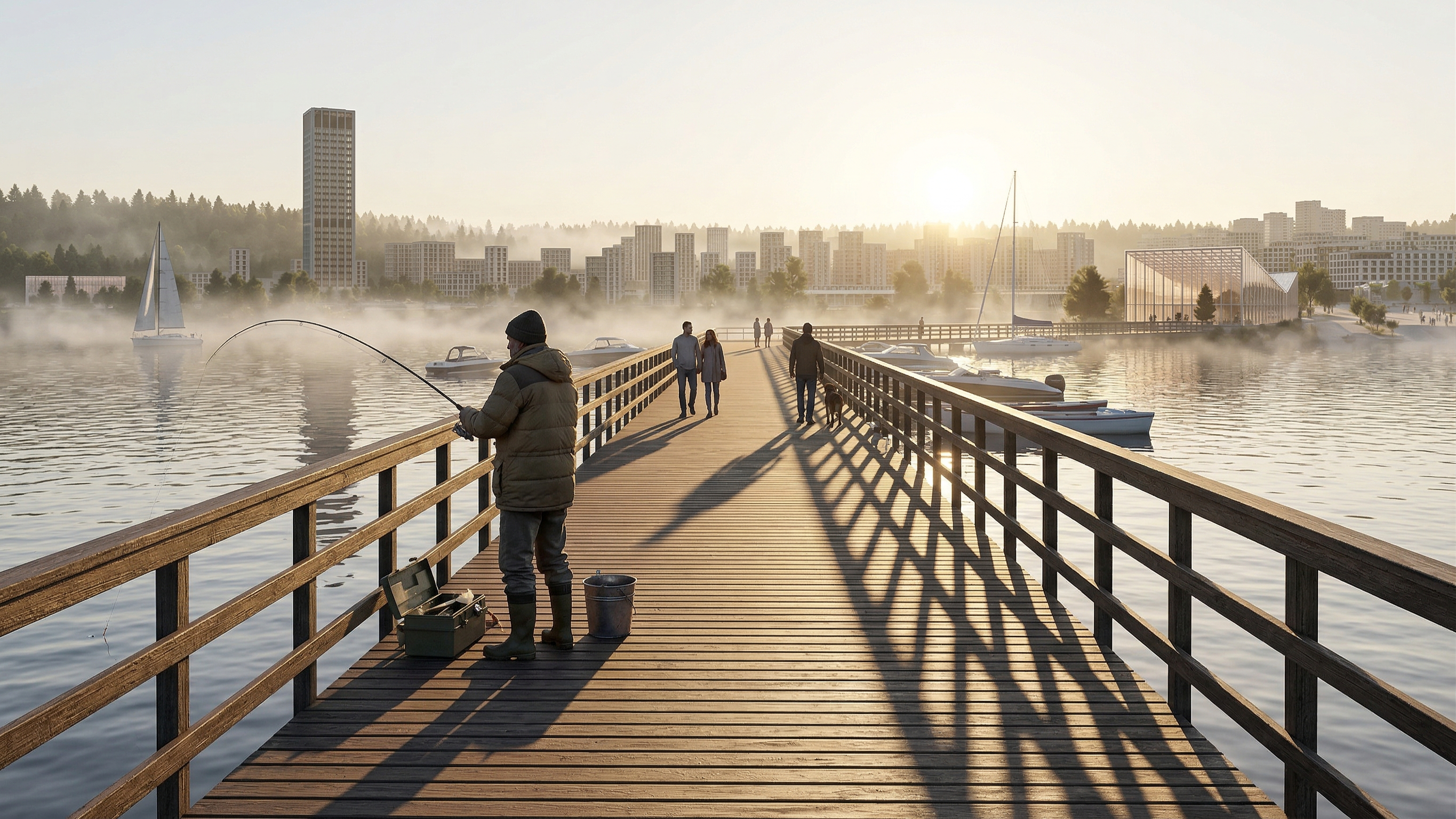 Ну масштаб ряби меньше, можно по маске через композит сделать участки с более\менее интенсивной рябью. Так же к берегу рябь больше. Ну и немало красоты дает блик и отражения зданий + дымка, хотя она к воде не относится. Для большего кайфа можно добавить деталей на дне. Ну и корабликов.