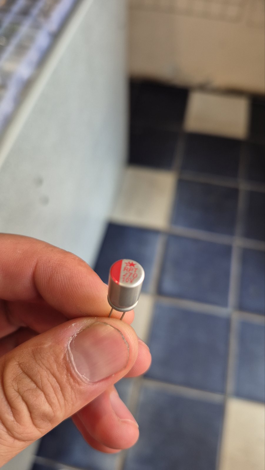 Думай дай заменю термопасту. Снял крышку, вроде аккуратно все снимал. А термопаста собралась по периметру чипа на краях. В середине как что-то мокрое, водичка. По идее так не должно быть. Но тут беда отпал конденсатор 270, там идиотский зазор есть видно при снятии цепанул. Ну не беде думаю. Начал припаивать, а там очень короткие ножки. Прям зацепиться невозможно. Но в итоге и они оторвались. Нужно заказывать этот конденсатор.