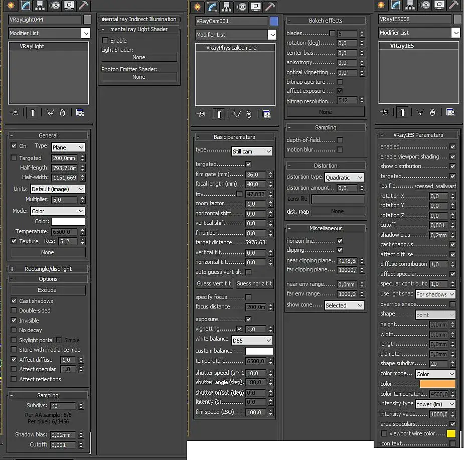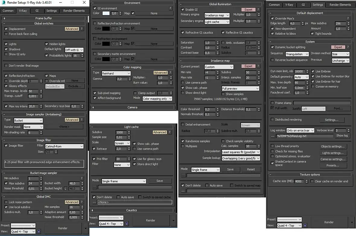 Выкладываю настройки. Ранее был макс12 и vray2.0 проблем не было. Поставили 15 макс и vray 3.4 рендерит с ужасными шумами, четкая черная граница где свет и непонятная резкость на рендере.