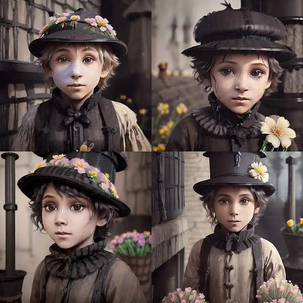 "Фотореализм, ребенок, трубочист, цветы, платье..."
