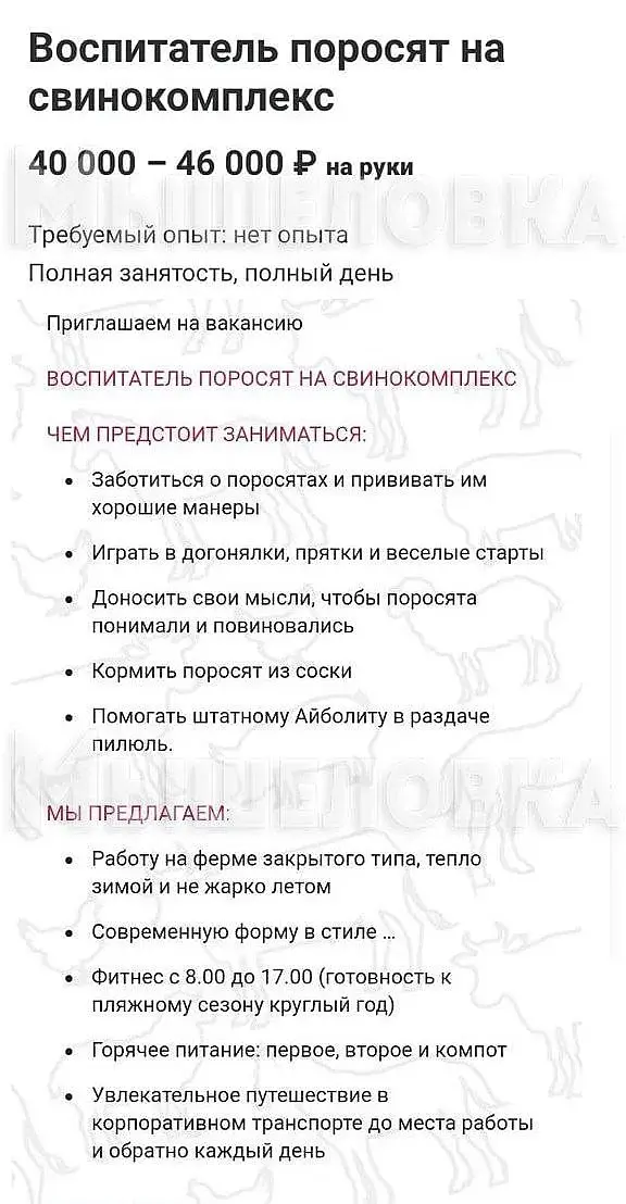 Был подниматель пингвинов, отпугиватель белых медведей , теперь вот воспитатель поросят)) И ведь это все реальные вакансии